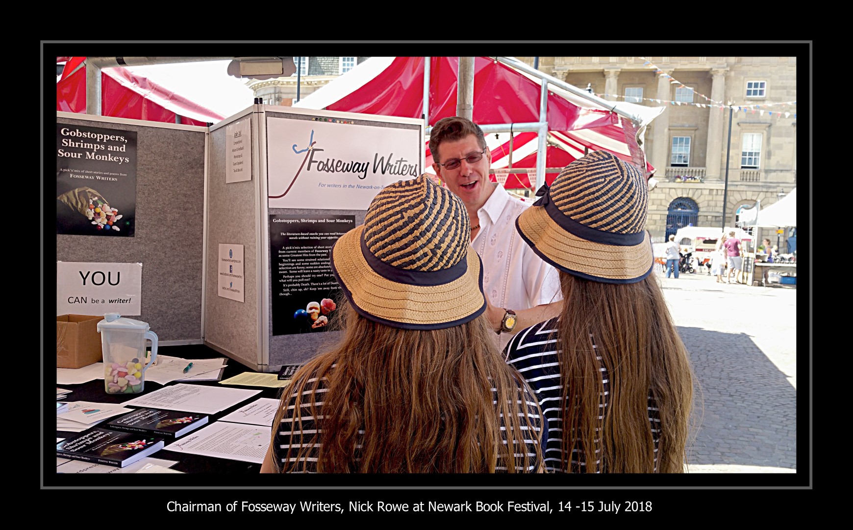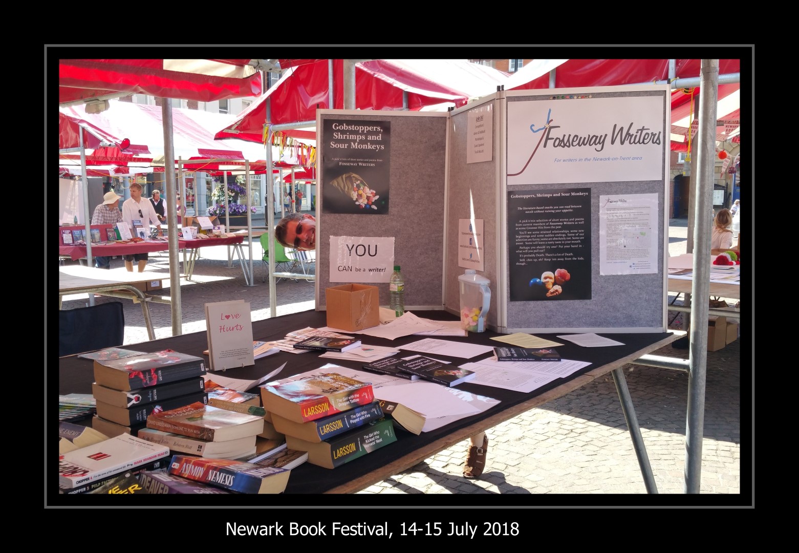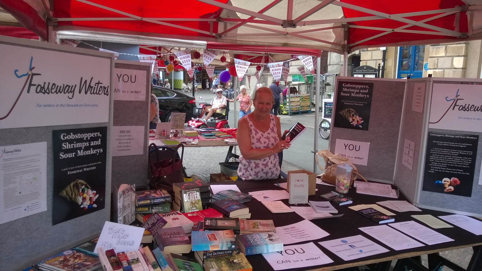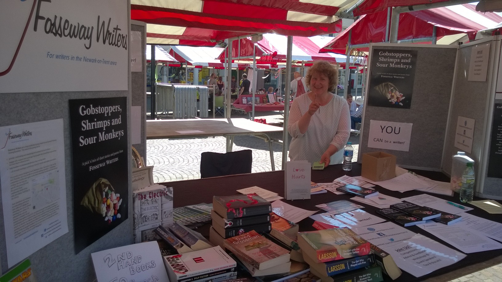 And the candy sweets that feature on the front cover of our book were handed out to anyone who bought a book. It was all awesomely good and huge thanks go out to Sara Bullimore and her team (hi Chelsea and Jorja Le Galliene, who has the most fabulous name and needs to be an author so we can see that on a book) and all of the volunteers and participants. But a big thank you to all members of Fosseway Writers that have helped over the last year in getting us ready to release a new anthology, produce material and activities for the Festival and then come and talk to the great Newark public in the Market Place. You’re all wonderful 🙂