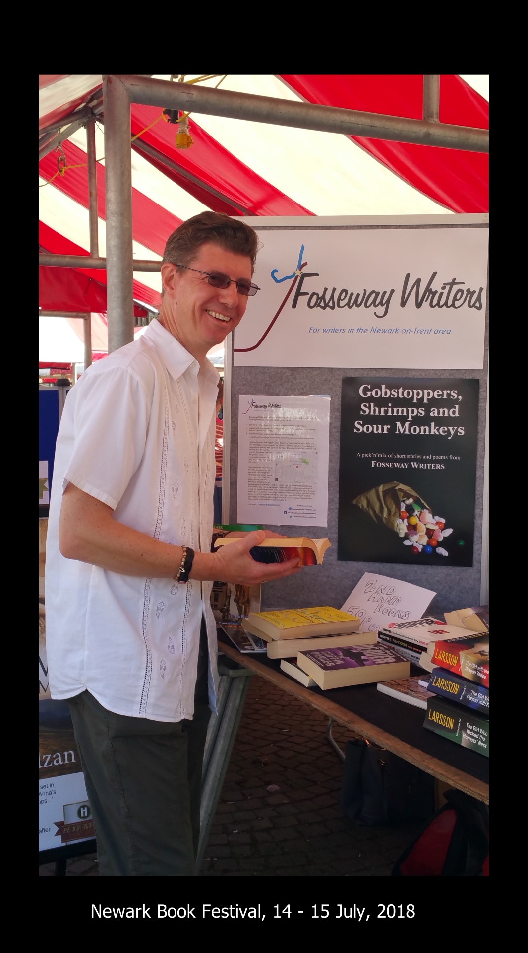 Fosseway Writers had a very successful couple of days at Newark Book Festival (14-15 July 2018) where we basked in sunshine and literature. To be honest, it was a little bit too hot – temperatures hit 30 degrees (the mid 80s in Fahrenheit) and we were grateful for the shade of the market stall.